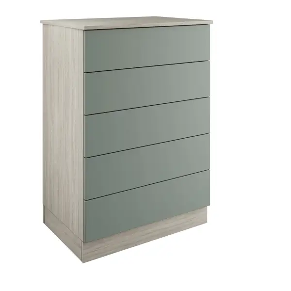 The classic / shaker sage green 5-drawer tallboy chest comes with MDF slab style drawer fronts drawer fronts in a standard matt finish, urban oak chest and soft close drawer runners.