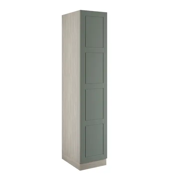 A sage green single wardrobe with single rail, that comes with MDF 4 panel shaker frontals in a standard matt finish, a urban oak cabinet and soft close hinges.